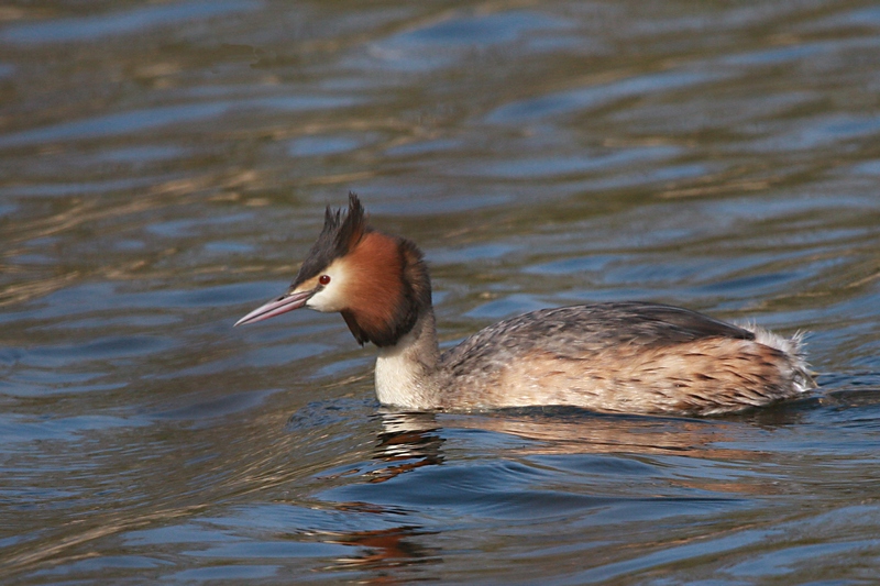 Великий норець, чомга ( Podiceps cristatus L.) — найбільший серед норців, але менший від свійської качки. В шлюбному оперенні на голові добре помітні іржастий, який до краю поступово переходить в чорний, «комір» та довгий роздвоєний чорний «чуб» (восени та взимку «комір» і «чуб» відсутні). Верх тіла темно-бурий, шия й низ тіла білі, дзьоб червоний. В польоті добре помітні білі другорядні махові. У молодого птаха дзьоб жовто-зеле- ний, «комір» і «чуб» відсутні, щоки строкаті.