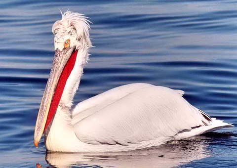 Кучерявий пелікан (Pelecanus crispus Bruch) —дуже схожий на рожевого пелікана (за розмірами трохи більший), від якого відрізняється білим без рожевого полиску забарвленням і наявністю на голові й задній частині шиї кучерявого «чуба». Кінці крил сіро-бурі, ноги сірі. У молодого верх тіла із світло-бурими плямами. Пера потилиці і шиї майже не кучеряві.