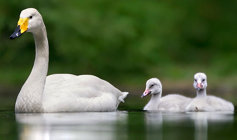 Лебідь-кликун (Cygnus cygnus) за розміром і забарвленням схожий на лебедя-шипуна. Легко відрізняється від попереднього виду характером поведінки на воді. Плаваючи, шию тримає вертикально; голова і дзьоб при цьому спрямовані вперед, крила притиснуті до боків тіла. У дорослого птаха дзьоб жовтий з чорним кінцем, у молодого — рожевий з чорним кінцем.