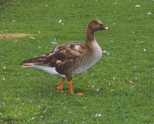 Гуменник (Anser fabalis) розміром із свійську гуску. Забарвлення сірувато-буре, знизу світліше. Голова і шия помітно темніші, ніж спина. По всьому тілу йдуть поперечні білі смужки. Ноги оранжево-рожеві.
