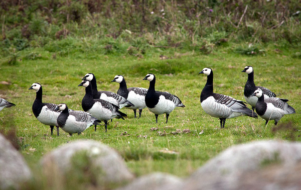 Білощока казарка (Branta leucopsis) — вигляд, як у гуски (дещо більша за чорну казарку). Верх голови, шия і груди чорні, спина сірувато-бура з поперечними смугами, черево сірувато-біле. На лобі, горлі і щоках біла пляма.