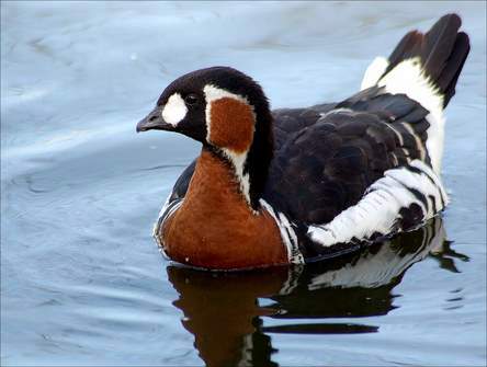 Червоновола казарка (Rufibrenta rulicollis Pall.) розміром з чорну казарку. Забарвлення строкате, з чорного, каштаново-рудого і білого кольорів. Каштановий колір скрізь відділяється від чорного вузькими білими смужками.
