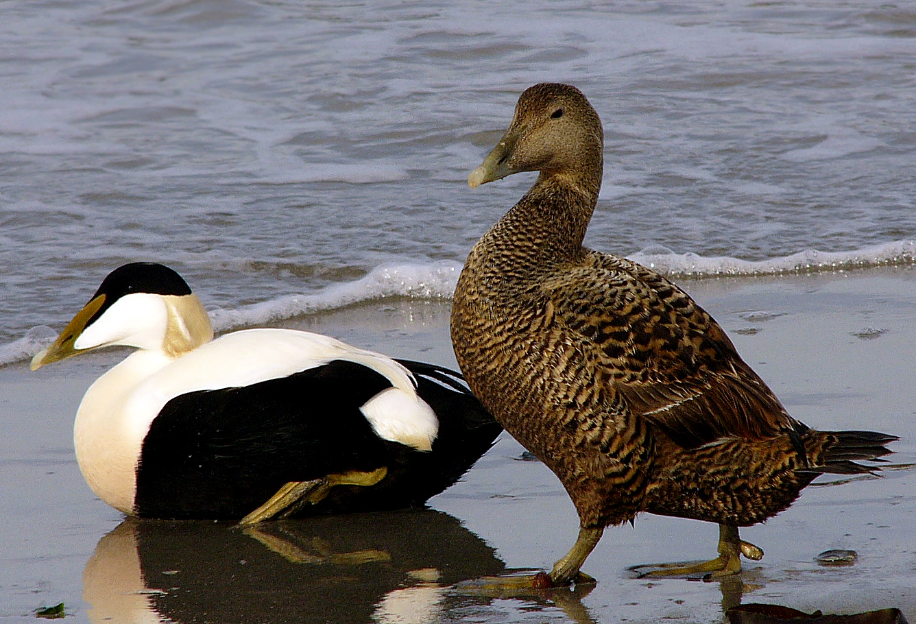 Звичайна гага (Somateria mollissima L.) розміром із свійську качку. Самець має строкате вбрання. Голова і спина білі, груди рожеві, на голові чорна «шапочка» (потилиця зелена). Черево, хвіст і надхвістя чорні. Самка рудувато-бура з темним поперечним малюнком.