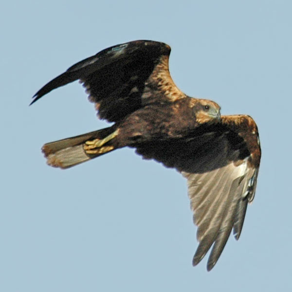 Болотяний лунь (Circus aeruginosus L.) найбільший з усіх наших лунів (трохи більший за сіру ворону). Від усіх попередніх лунів чітко відрізняється темним забарвленням і відсутністю білого надхвістя. Самець зверху каштаново-бурий, з сизим хвостом і крилами (кінці їх темні). Голова й частина шиї світло-бура. Низ тіла рудий, з темною пістрявістю, надхвістя білувате. Доросла самка темно-бура, з вохристими плямами на голові, волі і плечах. Молодий птах схожий на самку, але голову має темну, одноколірну.