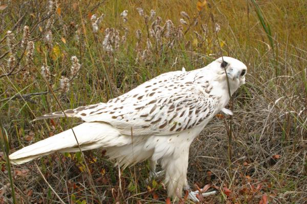 Кречет (Falco gyrfalco L.) — птах масивніший і більший від балобана. Забарвлення оперення варіює від чисто білого або білого з невеликою кількістю плям до більш темного, з бурувато-сірим верхом і білуватим, з пістрявинами, низом. «Вуса » малопомітні, ноги жовті. Молодий птах бурий.