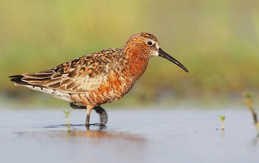 Червонозобик (Calidris ferruginea) - кулик розміром із шпика, з досить довгим, помітно зігнутим донизу дзьобом. У весняному оперенні його легко пізнати по інтенсивному каштаново-рудому кольору нижньої сторони тіла. Верх рябий — чорний і каштаново-рудий. Крила бурі, підхвістя біле, надхвістя смугасте, біле з чорним (добре виділяється в польоті). В зимовому оперенні верх сірий з ряботинами, низ білий з вохристим нальотом на волі, надхвістя біле.