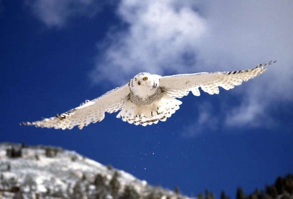 Біла сова (Nyctea scandiaca L.) - сова велика за розмірами, але менша за пугача, з яскраво жовггими очима. Дорослий самець майже зовсім білого кольору. Самка і молодий птах також білі, але з бурими поперечними смугами.