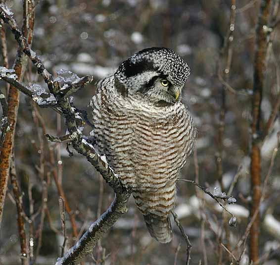 Яструбина сова (Surnia ulula L.) — сова середня за розмірами (з ворону), з довгим поперечно-смугастим хвостом, невеликою без пір'яних «вушок» головою та з відносно короткими крилами. Верх тіла темно-бурий або сіро-бурий, з світлими плямами, а низ білуватий, з темним поперечним рисунком («яструбиний»). Лицевий диск білий, з бурими смугами по його боках.