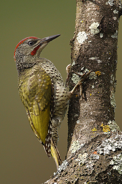 Зелений дятел (Picus viridis L. ) - спина яскраво-зелена, над хвіст я золотисто-жовте, низ тіла зеленувато-білий. Крила і хвіст бурі, з світлими поперечними смугами. Верх голови і шиї червоний. На боках горла чорні «вуса» (у самця чорні з червоним), а на боках тіла й підхвісті темні цятинки і поперечні смужки.