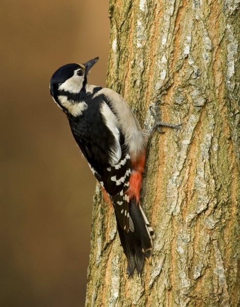 Великий строкатий дятел (Dendrocopos major L.) – птах трохи більший від шпака. Спина, верх голови і шиі, крило, хвіст і смуги від дзьоба до потилиці чорні. Щоки, лоб, груди, черево, смужки на крилах і хвості та велика пляма на плечах білі. Підхвістя червоне. У самця потилиця, а в молодого весь верх голови червоні (самка червоної «шапочки» не має). Біле забарвлення щоки і шиї поділено чорною поперечною смугою на дві половини.
