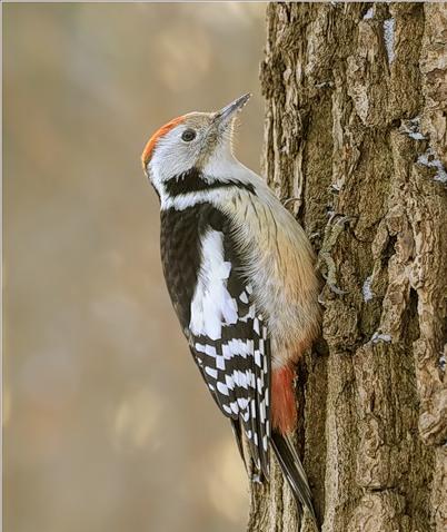 Середній дятел (Dendrocopos médius L.) — менший від великого строкатого дятла, на якого дуже схожий, але легко відрізняється від нього тим, що у самця і самки на голові є досить велика червона «шапочка». Низ тіла світло-жовтий,з чорними поздовжніми плямами на боках. Підхвістя рожеве. Дуже рухливий дятел. Кору довбає порівняно рідко і слабо. Звуки крик «кік-кік-кік-кік», що часто повторюється.