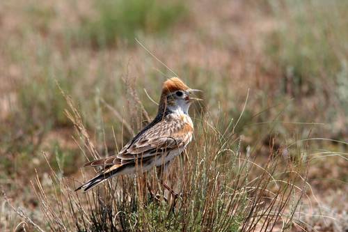 Білокрилий жайворонок (Melanocorypha leucoptera) — птах більший за горобця. У самців верх голови, надхвістя і боки грудей іржасто-руді, спина сіро-бура з широкими темними плямами, низ білий. Чорних плям по боках вола немає (!). Особливо характерне біле «дзеркальце» на крилах.