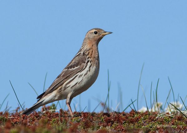 Червоногрудий щеврик (Anthus cervina Pall.) — самці мають яскраві цегляно- червоні або руді горло, воло і груди, на яких виділяються темні пістрявини. Самки і молоді птахи схожі на лісового й лугового щевриків, але й у них є червонуватий відтінок на горлі, волі й грудях.