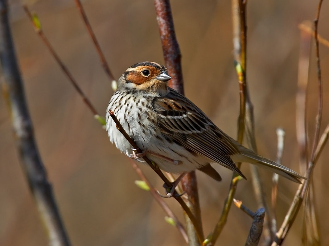 Вівсянка-крихітка (Emberiza pusilla) - дрібна вівсянка (значно менша від горобця). Голова іржасто-руда з чорною смугою над оком. Верх тіла сірувато- бурий з темними рисками. Низ брудно-білий з досить широкими поздовжніми чорнуватими ряботинами на грудях і боках.