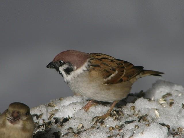 Польовий горобець (Passer montanus L.) — від хатнього відрізняється коричнево-каштановою зверху головою, чорною плямкою на білих щоках і двома світлими смужками на крилах. Самці і самки забарвлені однаково.