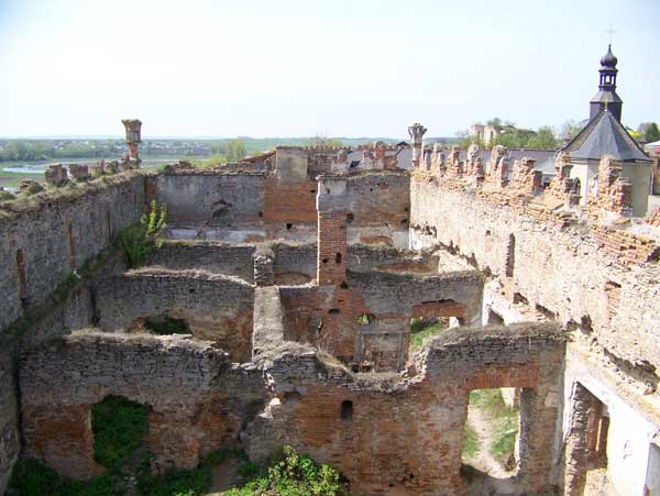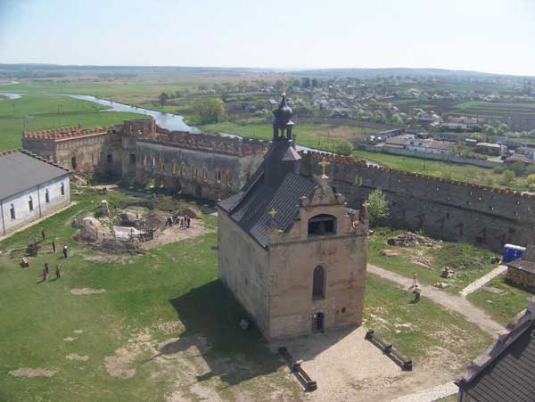 що мурований периметр укріплень давнього ядра меджибізького замку сформувався саме в 2-й половині XIV ст. На східному кінці трикутного в плані укріплення в цей час існувало дві башти: кругла (зовнішній діаметр -10 м; стіни завтовшки 1,8 м складені з жолобчастої цегли 5,5x15...16х27...29 см) та прямокутна (14x16 м; стіни завтовшки 3 м - з вапняку). Прямокутна башта була добудована до круглої зі сходу, на зламі оборонних мурів, і повністю висунута в бік поля, внаслідок чого кругла башта опинилася всередині замку. У розпланувальній схемі та оборонній концепції XIV ст. простежується певний зв'язок з литовською фортифікаційною традицією, зокрема з замками міст Гродно та Новогрудок Замкову церкву, розміщену між західним муром давнього ядра замку та сучасним західним муром, теж пов'язують з періодом XIV ст.. З 1444 р. Меджибіж, що лежав на з'єднанні двох татарських військових шляхів - Кучманського та Чорного, увійшов до складу Королівства Польського. Первісне укріплення було розбудоване в західному напрямку. Добудовано чотири прясла оборонних мурів заввишки до 21 м з численними бійницями, а також наріжні башти: з півночі - круглу (зберігся лише нижній ярус, верхні перебудовано в XIX ст. на восьмигранні); на північному заході - п'ятигранну; третя, південно-західна башта (Г. Логвин вважає її надбрамною) не збереглася. Різні дослідники датують башти в широкому хронологічному діапазоні - від XV до XVII ст. Площа замку в XV-XVI ст. становила понад 1 га.Повністю збережена північно-західна (Лицарська)