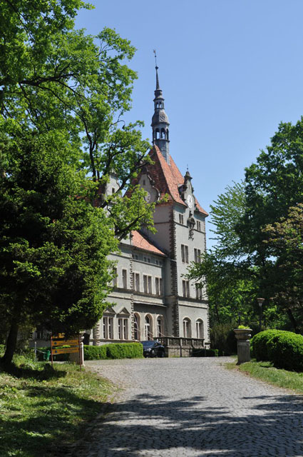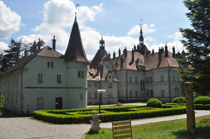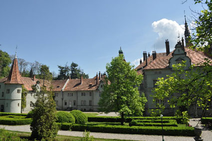 Замок прекрасно виглядає з усіх боків, знаходиться у центрі, так званого, англійського парку, в якому росте понад 40 видів рідкісних рослин. Є тут і озеро, обриси якого раніше повторювали контури Австро-Угорської імперії. В мисливському замку бенкетувала родина графів Шенборнів зі своїми численними гостями, які з'їжджалися сюди майже з усієї Свропи. їх приваблювала мальовнича природа, ліси, багаті на різноманітну дичину. Серед мисливських трофеїв були рідкісні представники тваринного світу: карпатський олень, ведмеді, дикі кабани, лисиці, кози.