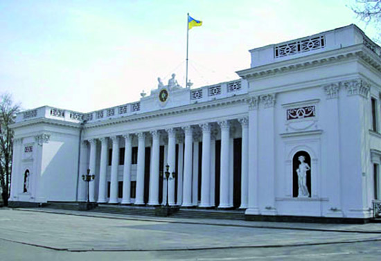 Будівля розташована на ділянці значного пониження рельєфу й активно формує перехрестя вулиць Пушкінської та Буніна.Споруджена в 1894-1899 pp. за проектом одеського архітектора О. Бернардацці. Будівництву передував всесвітній конкурс на кращий ескізний проект будинку (1891 p.), переможцем якого виявився архітектор В. Прохаска. Його проект був перероблений О. Бернардацці відповідно до вимог замовників. Архітектором-будівником був Г. Донський. У 1900 р. на честь 50-річчя творчої діяльності О. Бернардацці у лоджії головного входу встановлено мармуровий бюст зодчого, виконаний скульптором Б. Едуардсом. Він же, а також скульптори Молінарі і Манцоне створили скульптурне оздоблення. Монументальний живопис в інтер'єрах виконаний флорентійським художником Кассіолі й петербурзьким художником М. Каразіним. Будинок реставровано за проектом архітектора В. Шевченко та ін. наприкінці 1950-х років. Нині використовується як міська філармонія.У стилістичному вирішенні переважає застосування історичних фіорм венеціанської готики та меншою мірою - неоренесансу. Різновисока, зі складним характером об'ємно-просторової структури, споруда має підвал, цокольний та основний поверхи. її розпланувальний прямокутник містить розташований у східній частині внутрішній двір, сформований периметрально розміщеними допоміжними двоповерховими крилами зі службовими приміщеннями. Основні приміщення біржі розташовані в домінантних зовнішніх крилах споруди, які симетрично фланкують квадратну в плані призматичну вежу з глибокою відкритою лоджією головного входу з боку вул. Буніна. Вежа накрита чотирисхилим наметовим дахом. Лоджія має прямі, на три марші, мармурові парадні сходи, що ведуть до галереї головного входу в рівніосновного поверху. За нею, в західному дворовому крилі, розташовані парадний вестибюль та фойє із входами в операційний зал, який є головним приміщенням і займає весь поверх основного західного крила.Стіни - муровані. У конструкції баневого перекриття лоджії та ростральних колон, які фланкують центральні сходи, а також в облицюванні цокольного поверху широко використано бетон.Центрально-осьову симетрію на головному фасаді фіксує розміщення головного входу з парадною лоджією. Наданню їй урочистого характеру сприяє поєднання мармурових головних сходів та галереї з балюстрадами й двома монументальними ростральними колонами зі складним вертикально розкритим внутрішнім простором. Цей простір створений системою з чотирьох попружних арок, пандатив і сферичного склепіння, в оздобленні яких широко застосовано орнаменти й інкрустації зі штучного різнобарвного каміння. Гладінь стін, оздоблених тонованими керамічними плитами, відтіняють підкреслено акцентований декор головного входу та масивний цоколь, опоряджений глибоким дощаним рустом з поперечними швами. Чіткого ритму й виразності надають фасадам великі подвійні та потрійні вікна з типово готичним складним малюнком рам і стрілчастими архівольтами. У простінках цей ритм підтримується дещо меншими за розмірами глибокими едікулами, а в рівні широкого масивного аркатурного фриза й карниза, по осях крайніх вікон фасаду на вул. Пушкінській - об'ємно розвиненими едікулами з високими готичними шпилями. Гармонійною пропорційністю вирізняються дещо відмінні від вуличних дворові фасади, 1 -й