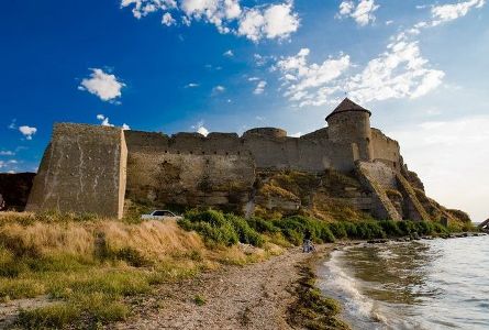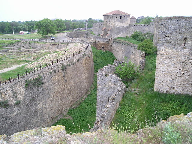 південну браму у вигляді невеликого аркового отвору, що закривався звідним мостом. Цитадель, ймовірно, мала другу, зовнішню лінію оборонних мурів, фрагмент якої зберігся в основі північного муру, що проходить по нижньому пругу скель з боку лиману.З 1400 р. Білгород-Дністровський увійшов до складу Молдавського князівства під назвою Четатя-Алба. У 1438 р. на південь від цитаделі почалося будівництво грандіозної оборонної системи загальною довжиною понад 2 км з 26 баштами. Ці укріплення сформували дві обо-ронні лінії, що охопили з півдня територію цитаделі, Верхнього міста (розташованого за принципом "окольного града") та Нижнього міста (передмістя, пізніше названого Цивільним двором). Наприкінці XIX ст. на території цих укріплень віднайдено плити з гербом молдавських господарів та написами, що підтвердили час будівництва (1438-1454 pp.) й дали змогу7 встановити ім'я будівничого - майстра Федорка, котрий, на думку дослідників, походив з Галичини.Укріплення Верхнього міста, яке призначалося для розміщення гарнізону, охоплювали з півдня замок-цитадель, в плані наближаючись до трапеції. Чотири з шести башт цієї укріпленої лінії розміщувались на східному боці, з боку поля. Передмістя (Нижнє місто) було оточене подвійним оборонним муром. Внутрішній мур завтовшки до 5 м і заввишки 6-7 м з'єднував триярусні (до 11 м заввишки) бойові й глухі башти квадратної, восьмигранної та п'ятигранної у плані форми, що розміщувалися з інтервалом близько 30 м. Зовнішній оборонний мур, тонший і нижчий, проходив паралельно, на відстані 5-8 м від першого. Йоп підошва сягала дна оборонного рову, ширина яког становила 15 м, а первісна глибина - 21 м. У разі потреби рів заповнювався водою з лиману.З західного боку до Верхнього та Нижнього міс вузькою смугою, що простяглася вздовж лиману, прилягала ще одна частина фортеці - Портовий двір. У товщі його фортечних мурів знаходилися галереї, що вели до лиману, а також водогін з глиняних труб. Підоднією з восьмикутних башт проходив підземний хід, що виходив нагору біля села Переможного; другий хід ішов з Верхнього міста до південної околиці. Нині підземелля засипані. Укріплення Аккерманської фортеці є унікальними не лише в Україні, але й далеко за її межами. Роботи з реставрації фортеці ведуться з I960 р. під керівництвом І. Шмульсона та І. Іваненко.
