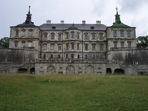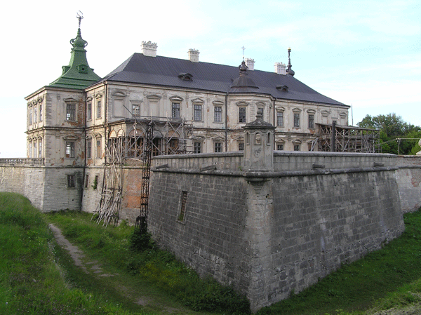 Мурований замок споруджено в 1635-1640 pp. на місці давніших укріплень коштом і на замовлення власника Підгірців - Великого коронного гетьмана С. Конецпольського за проектом французького військового інженера Г. Л. де Боплана. Будівельними роботами керував італійський архітектор Андреа дель Аква. Замок є центром великого архітектурного ансамблю, до складу якого входять парк з парковими спорудами XVII-XVIII ст., костел св. Йосипа 1766 p., гетьманський заїзд початку XVIII ст. Замок зазнав руйнувань у 1648-1651 pp., 1б72та 1688 pp. У1728-1779 рр його відбудовано з надбудовою 3-го поверху палацового корпусу. Після нього в замку було зібрано цінну колекцію творів мистецтва. Реставрацію замку здійснено 1865 р. У 1953 р. замок повністю згорів. Через три роки, у 1956 р. його відремонтовано, проведено внутрішнє перепланування. З 1997 р. замок передано львівській картинній галереї й розпочато реставрацію.Замок розташований на прузі високого плато, що домінує над долиною, до якої він обернений парковим фасадом, і є важливою архітектурною домінантою в краєвиді. Належить до поширеного в Європі у XVII ст. типу оборонних палаців з поєднанням італійської та голландської фортифікаційних систем. Взірцем слугував французький палац Шато Неф у Сен-Жермені.Замок - симетричний щодо поздовжньої осі всього ансамблю, квадратний у плані, з чотирма наріжними бастіонами та внутрішнім двором. Північний бік займає палац, а з інших боків - каземати оборонних стін, приміщення яких використовувалися Для господарських і, частково, житлових та оборонних потреб. Куртини стін і фаси бастіонів облицьовані каменем. Плоскі перекриття казематів утворюють терасу, обгороджену балюстрадою. На рогах бастіонів влаштовано вишукані навісні башти - кавальєри. По периметру замок оточує широкий сухий рів з контрескарпом.Палац - прямокутний у плані, з наріжними квадратними й центральним гранчастим ризалітами. Первісно - двоповерховий з триповерховими ризалітами, нині - триповерховий.