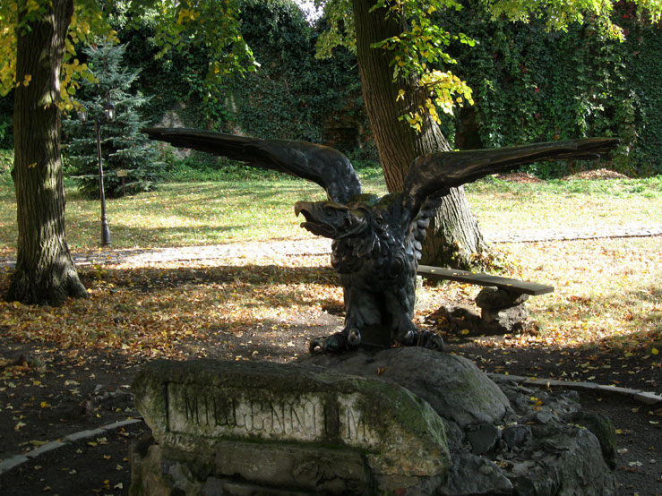 Ще одна скульптура на замковому дворі - бронзовий могутній турул з широко розправленими крилами. У дзьобі він колись тримав шаблю, від якої в даний час залишився лише фрагмент. У замок скульптура потрапила з Вилока (Виноградівський район), де її встановили в 1903 р. на місці переможної битви Ференца Ракоці II з австрійськими військами.