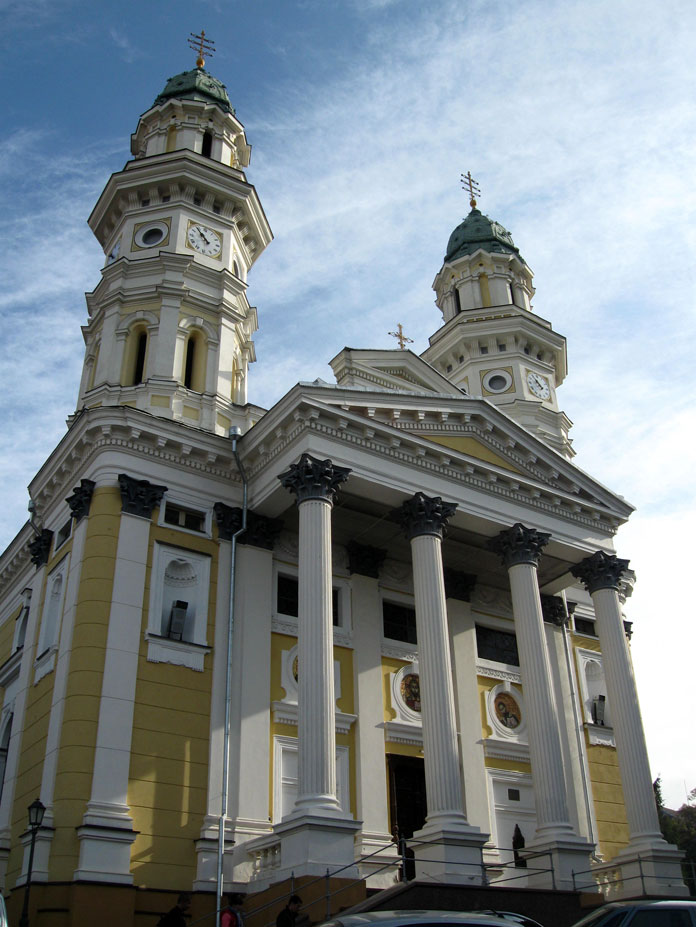 Здійснені за проектом Луки Фарби в 1875-1878 рр.. перебудови в стилі пізнього класицизму з рисами необароко додали споруді є неповторна чарівність. У храмі збереглося багато творів Йосипа Бокшая. Підвальну частина собору займає пантеон ієрархів греко-католицької церкви. У спеціальних нішах розміщено близько 70 поховань. 28 червня 2003 р. тут перепоховали мощі єпископа Теодора Ромжу. Після приєднання Закарпаття до СРСР влада змушувала його відректися від віри, однак владика рішуче відмовлявся. Тоді на нього вчинили замах, інсценізація-ванне під автомобільну аварію. Однак єпископ вижив. Вже в лікарні, за особистим розпорядженням найвищого керівництва, йому підіслали «медсестру», яка за допомогою отрути кураре вбила його. У 2001 р. під час свого візиту в Україну папа Іван Павло II Беаті-ваних Теодора Ромжу як мученика за віру.