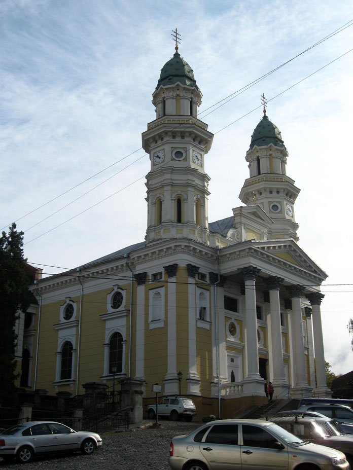 До собору зліва примикає колишня єпископська резиденція (спочатку з 1640 по 1644 г -. Єзуїтська колегія). Сьогодні в ній розташована бібліотека національного університету. З сакральних споруд міста увагу привертають також римо-католицький костел Св. Георгія, розташований в центрі міста на вул. Волошина, реформатська церква (1793-1796) на площі Жупанатс-кий, побудована в 1930 р. російськими емігрантами, Покровська церква на набережній і одна з найбільших в Європі ортодоксальних синагог (1904), побудована в