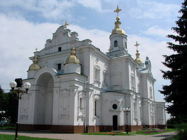 УСПЕНСЬКИЙ СОБОР у Полтаві. Полтави плани 1-ї третини 18 ст. фіксують на стрілці мису Городища головну домінанту міста – дерев’яний багатозрубний багатоповерховий собор, поруч з яким двох’ярусна дзвіниця. 1748 поряд з дерев’яним, трохи південніше від нього, закладено мурований собор. За зразок правив Хрестоздвиженський собор у Полтаві. Фундаторами були полтавського полковник А. Горленко, обозний А. Руновський, полковий суддя Г. Сахновський, військовий товариш Д. Білуха та ін. Будував собор київський «мурар» Стефан Стабанський (Степан Стобенський). Собор був освячений 1770. В образі тринефного шестистовпного, з трансептом, нартексом і хорами, первісно – трибанного, а з 1780 – п’ятибаиного собору домінував масивний, слабо розчленований основний обсяг, з яким контрастували бані і вишукані фронтони. Характерним був і естетично осмислений контраст лапідарних білих стін з хрещатими та прямокутними вікнами, розміщеними у два яруси і обрамленими тонкими наличниками з сандриками. У формуванні образу важлива роль належала чотирьом барокковим фронтонам примхливих силуетів. Ними вінчалися західний фасад храму, широка півкругла апсида та ризаліти бічних фасадів, що відповідали трансепту. Завдяки композиційно активному завершенню собор грав визначну роль у силуеті міського центру. Ця роль зросла, коли 1774–1801 перед західним фасадом звели чотириярусну чотиригранну муровану дзвіницю у стилі класицизму, увінчану куполом з високим шпилем. Первісно собор був п’ятипрестольним. Окрім головного престолу Успіння Богородиці, внизу було 2 престоли – Петропавлівський та Іллінський (останній ліквідовано 1894). На хорах були Михайлівський і Варваринський приділи (знято 1869). Того ж року перебудовано сходи на хори, ризницю і паламарню. В інтер’єрі – великий чотириярусний різьблений іконостас у стилі класицизму. 1899 собор розширено за рахунок західної прибудови, вмістимість його досягла 10 тисяч чоловік. Крім того, на протязі 19 ст. собор зазнав ще деяких перебудов: бароккові двох’ярусні бані з ковнірами замінено куполами спокійніших півсферичних обрисів з глухими ліхтариками. У 1-й половині 19 ст. територію обнесено мурованою огорожею з кованою залізною граткою і двома невеличкими купольними капличками з західної сторони обабіч дзвіниці. Визначною реліквією був дзвін «Кизикермен», відлитий 1695 коштом полтавського полковника П. С. Герцика з гармат, захоплених у турків. 1845 собор і Котляпевського І. П. садибу змалював Т. Г. Шевченко. 1934 зруйнований, збереглася дзвіниця, у якій розміщено експозицію з історії архітектури Полтави.