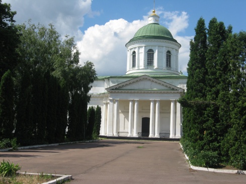 Має риси класицизму. Мурована, хрестоподібна. Великий круглий барабан з напівколонами несе позолочену баню. Стоїть на підвалі, склепіння якого спираються посередині на стовп. Наприкінці 19 ст. біля входів добудовано восьмиколонні портики тосканського ордеру з трикутними фронтонами, споруджено триярусну дзвіницю (не збереглася).