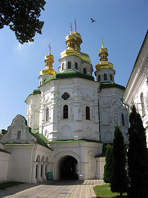 З південного боку до церкви прилягає аркада (хід до примі-щення церкви), яка спирається на чотири колони і має двосхилий дах, торець якого закінчується фронтоном, оздобленим пишним ліпним орнаментом. Настінний живопис всередині церкви виконаний на початку XX ст. учнями лаврської малярні під керівництвом художника I. С. їжакевича. Дерев’яний різьблений позолочений іконостас було зроблено майстрами в XVIII ст.