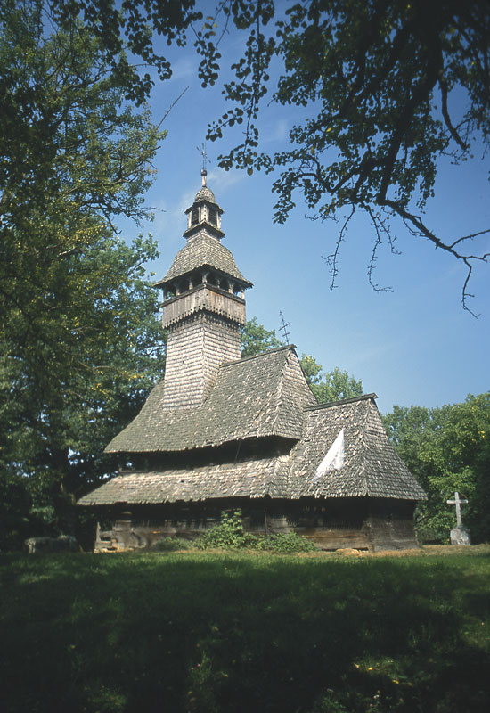 Церква стоїть на невеликому пагорбі в центрі села біля перехрестя головної вулиці й гірського потічка, що оперезує західну межу церковного подвір'я.Цей, один з найдавніших дерев'яних храмів України споруджено в урочищі Одарів у 1470 р. і незабаром перенесено до нинішнього місця. Подальші перебудови, на думку дослідників, виконувались у XVI та XVIII ст., оновлення іконостаса - в 1737 p., а розмалювання нави - наприкінці XVIII ст. Існує й дещо інша версія, згідно з якою церква св. Миколи була головною церквою православного монастиря, колись розташованого на околиці села. Там вона простояла 330 років і в 1800 р. була перенесена на сучасне місце.Тридільна двозрубна основа храму, виконана з грубих дубових плах і поставлена на муровані фундаменти, збереглась до рівня первісних зрубин, тобто до перекриття вівтаря і залому нави та бабинця. Довжина колод (близько 12 м) дала змогу зрубати п'ятистінок нави й бабинця однакової ширини. До нави був прирубаний вужчий прямокутний у плані вівтар. П'ятистінок перекрито стрімким шпилястим дахом, вівтар - дещо нижчим. Кути гребенів даху завершено сигнатурками (нині втрачені). План церкви розбито в гармонійних співвідношеннях, виходячи з діагоналі квадрата. Висотні розміри виведено з плану: висота храму до основ хрестів п'ятистінка дорівнює його довжині, а висота до основи хреста вівтаря - половині загальної довжини церкви.У XVI ст. внаслідок добудови основного об'єму нава стала двоярусною. У 70-х роках XVIII ст. бабинець набув завершення у вигляді вежі з ренесансним верхом і до нього було добудовано двоярусну7 галерею.Незважаючи на багатоетапність формування, церква вражає монументальністю й гармонійністю. Цьому сприяють єдиний для всієї споруди матеріал (деревина), злагоджена динамічна композиція та контраст між великими простими площинами укритих лемехом дахів, стін вежі і зрубів та вибагливими формами різьблених аркад бабинця, верху вежі.Композиція храму ґрунтується на динамічному наростанні об'ємів від короткого невисокого вівтаря до розчленованого широким піддашшям двоярусного основного зрубу та до домінанти споруди - високої стрункої каркасної вежі, врізаної в дах над бабинцем. У рівні заломів 2-го ярусу п'ятистінка на випустах зру-бин кріпиться піддашшя, що переходить у дах вівтаря. З заходу піддашшя спирається на аркаду з різьбленими стовпчиками й підкосами. Над піддашшям звис даху підтримується 2-м ярусом різьблених стовпів галереї. У могутніх іззовні відкритих зрубах стін прорубані маленькі віконечка: по одному - в 1-му, по двоє -в 2-му ярусі нави, одне - з півдня в бабинці, по одному - в трьох стінах вівтаря. Південне й східне вікна вівтаря - первісні, нерозтесані.Інтер'єр храму простий і небагатомовпий: між бабинцем і навою -прямокутний отвір; над навою і вівтарем - коробові склепіння, а над бабинцем -плоске перекриття; маленькі хори біля західної стіни нави; вздовж стін - лави. Головним змістовим та емоційним наповненням інтер'єру є малювання на стінах і стелях нави та вівтаря, а також позолочений різьблений іконостас із живописом, який поновлювався в 1737 р. майстром з Хуста. Нава, за припущенням дослідників, розмальована в кінці XVIII ст. під керівництвом досвідченого майстра Антоні Вали.Пам'ятка реставрувалася в 1970-1971 pp. (митці -О. Єрко, Р. Юсим, М. Сліпченко).