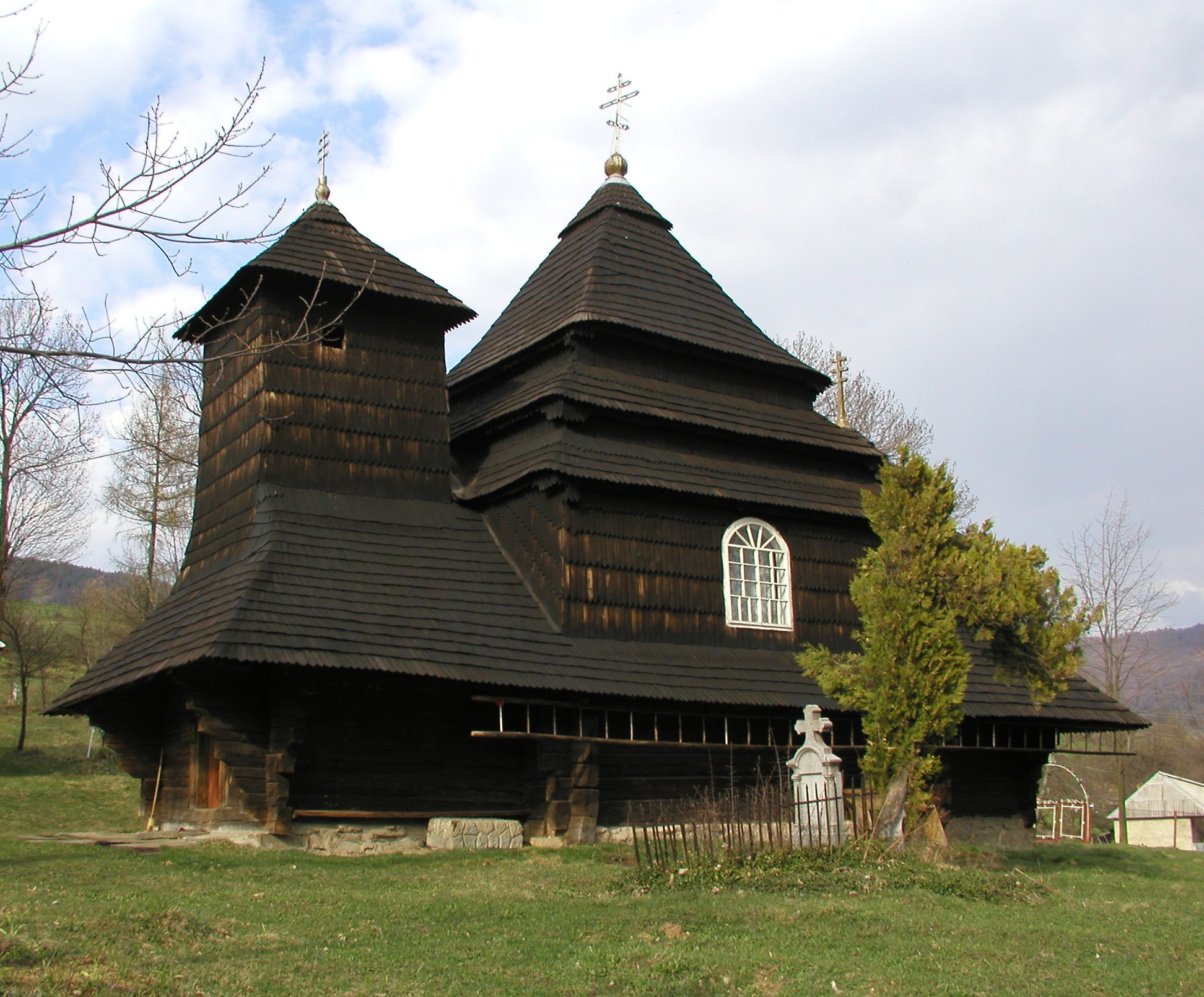 Дві дерев'яні будівлі, зведені 1745 p., - Михайлівська церква і розташована на північний захід від неї двоярусна дзвіниця - розташовані на одному з найвищих пагорбів неподалік Ужоцького перевалу, ефектно домінуючи над навколишніми гірськими краєвидами.Михайлівська церква належить до однієї з найсвоєрідніших локальних груп закарпатських дерев'яних храмів - ужоцької - з властивим для неї поєднанням рис бойківського та лемківського типів. Відповідно до традиційних церков Бойківщини споруда складається з трьох прямокутних у плані зрубів, причому центральний перевищує бічні за розмірами та висотою. Домінантна роль центрального зрубу -нави - виявлена у її завершенні, яке являє собою типовий для бойківських храмів чотиригранний верх з трьома невисокими заломами та монументальним пірамідальним наметом вінчання. Схожою є також структура чотиригранного верху вівтарного зрубу, проте він має лише два заломи й помітно поступається центральному за висотою. Значно нижча від центрального об'єму західна частина Михайлівської церкви, яка складається з низького безвіконного бабинця та розташованої над ним емпори з невисокою каркасною дзвіницею з наметовим завершенням. Двоярусна структура західного об'єму та каркасна конструкція дзвіниці над бабинцем споріднюють будівлю з дерев'яними церквами Лемківщини, проте симетричнии характер усієї композиції пам ятки на-ближає її до традиційних бойківських храмів. Значною мірою цьому сприяє також влаштування навколо будівлі пластичного піддашшя на фігурних кронштейнах.Ще послідовніше традиційна симетрична структура бойківських храмів виявлена в інтер'єрі Михайлівської церкви, композиційною домінантою якого виступає розвинений угору й добре освітлений простір нави. Важлива роль цього приміщення в інтер'єрі пам'ятки підкреслюється також розташуванням тут більшості елементів її внутрішнього оздоблення - іконостаса, фігурного вирізу й інших елементів. Ці особливості споруди, помножені на вишукані пропорції та мальовничий силует, перетворюють її на один з найкращих зразків дерев'яних храмів ужоцької групи в Закарпатті.Дзвіниця розташована на північний захід від храму й органічно вписується в загальну архітектурно-просторову організацію ансамблю. Являє собою один з найпоширеніших в Україні різновидів дерев'яної дзвіниці "четверик на четверику", нижній ярус якої, оперезаний піддашшям, є зрубним, а 2-й ярус - відкритою аркадою-галереєю з наметовим завершенням.