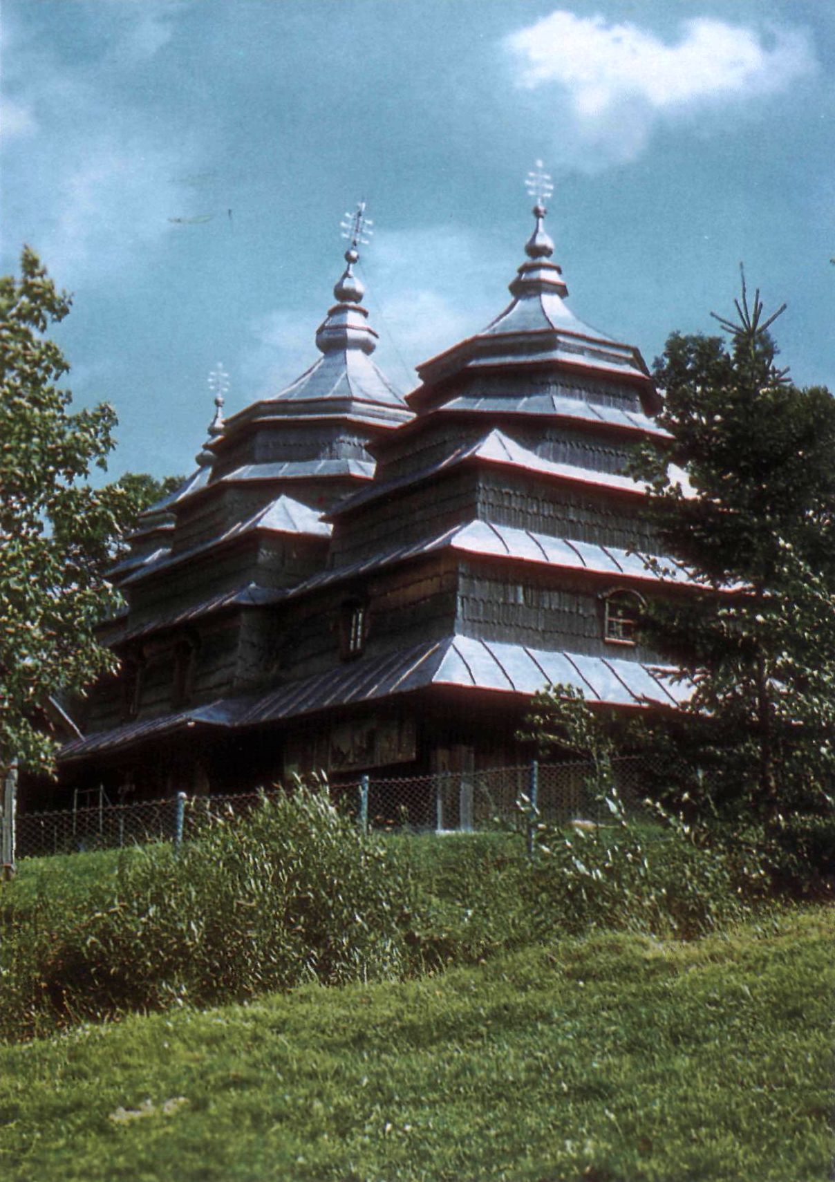 Церква та дзвіниця стоять у центрі села на високому правому березі р. Опір. Збудовані 1844 р. зі смерекових брусів майстром Білинем з розташованого неподалік с. Хітара. Церква - тризрубна, триверха, всі зруби в плані квадратні з більшим центральним. Обабіч вівтаря прибудовані одночасно з церквою ризниці. Усі три об'єми накриті восьмиїранними верхами з двома заломами, які "сидять" на подвійних четвериках. Дахи верхів - наметові з перехватом біля основи, завершені маківками без ліхтарів. Ризниці накриті двосхилими дахами з причілками. Церкву оперезує піддашшя на випусках вінців. Вінці з'єднуються замком з двобічним вирізом з залишком.В інтер'єрі верхи розкриті лише до верхнього рівня 2-го залому. Біля західної стіни бабинця влаштовано хори. Іконостас XIX ст. - чотириярусний, різьблений, позолочений, у 1974 р. грубо перемальований. На стінах - малювання С. Томасевича 1900 p., також пізніше перероблені. Біля південної стіни нави - вівтар 1898 p., збудований, як свідчить напис на ньому, В. Грегою, мальований М. Гондишем.Дзвіниця стоїть у південно-східному куті церковного подвір'я. Це триярусна, квадратна в плані будівля. Нижній ярус її - зрубний, два верхні - каркасні з відкритими аркадами під восьмигранним наметовим дахом. Дзвіницю оперезує піддашшя на випусках вінців зрубу.Обидві будівлі є виразними зразками дерев'яної архітектури бойківської школи.