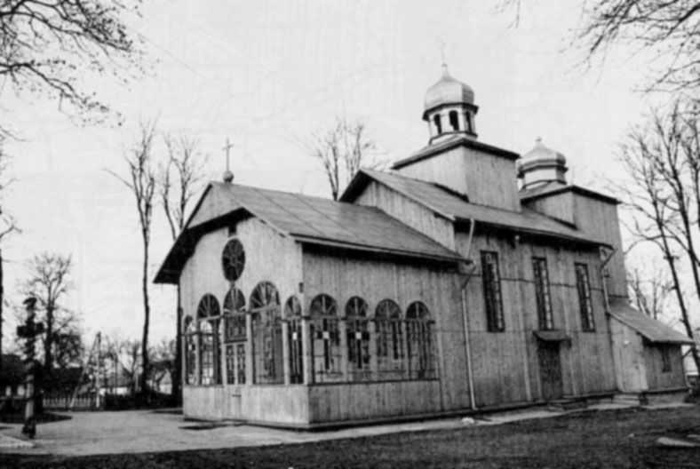 В 1515 р. в селі вже була парафіяльна церква. Наступна дерев’яна походила з 1667 р. і проіснувала до 1872р. У 1885р. (за іншими даними у 1881) зведено дерев’яний двоверхий храм. Четверик нави вкритий пірамідальним низьким наметом з ліхтарем і маківкою. З двосхилого даху бабинця здіймається четверикова вежа, вкрита таким же наметом. По другій світовій війні була діючою.