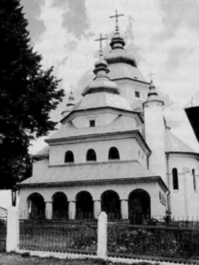 У 1578 р. в селі вже була церква. Існують згадки в документах 1614 р. про монастир. Попередня дерев’яна церква, згідно напису на західній стіні бабинця, збудована у 1662 р. Це була тризрубна одноверха будівля, увінчана на високому четверику нави шоломовою восьмибічною банею на восьмерику з одним заломом. У 1670р. вона отримала привілей від Франціска Стадницького. По першій світовій війні у 1922 р. на віддалі 500 м від неї збудовано нову муровану, хрещату в плані, триверху церкву за проектом Олександра Лушпинського. Наву споруди на високому восьмибічнику завершує дзвоняста баня, яка переходить в грушасту, увінчану ліхтарем і маківкою. Такі ж, тільки менші бані здіймаються на низьких восьмибічниках бабинця і вівтаря. Бабинець, з аркадою на другому ярусі, флан-кований на чільному фасаді восьмибічними вежами з таким же завершенням. Поліхромію церкви виконав художник Дем’ян Горняткевич. Стару церкву залишили як пам’яткову. У середині 1980-х pp. її розібрали і перевезли в Київ в Музей народної архітектури та побуту України, де вона повинна бути встановлена в експозиції Західної України.