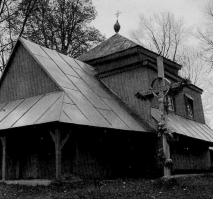 Вперше в документах 1507 р. згадується існування в селі парафіяльної церкви. У 1588 р. вона отримала привілей від дідича Адама Юзефа Мнішка. Існуюча дерев’яна тризрубна одноверха будівля, завершена чотирибічним наметовим верхом з одним заломом над навою, збудована у 1728 р. На початку XX ст. інтер’єр її розмальований олійним стінописом. Зберігся різьблений чотириярусний іконостас та різьблений головний вівтар з XVIII ст. Поряд розташована дзвіниця XVIII ст. стовпової конструкції.