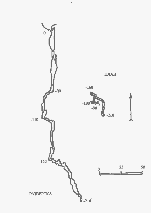 Вхід розташований в стіні карстової воронки. Вхідна 85-метрова шахта через систему вузьких лазів виводить в серію каскадних колодязів глибиною 8-20 м. З глибини 160 м починається крутопохилий хід з каскадами 2-5 м і колодязями 10-17 м.