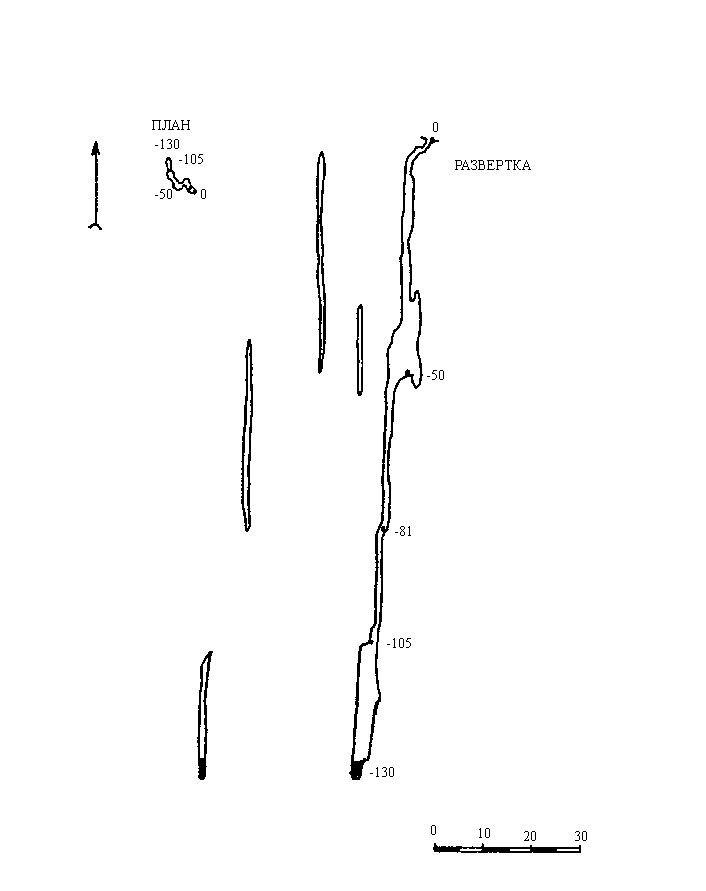 Складається з вхідної похилої 5-метрової ділянки та каскаду шахт глибиною 25-45 м.