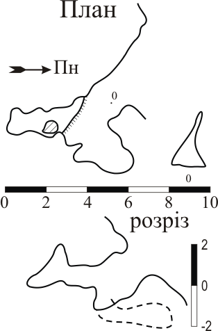 Вона являє собою дві перпендикулярні камери довжиною 5 і 10 метрів. Стіни її вкриті молочно- білим прозорим кальцитом із зеленуватим натеком у формі кам'яних квітів.