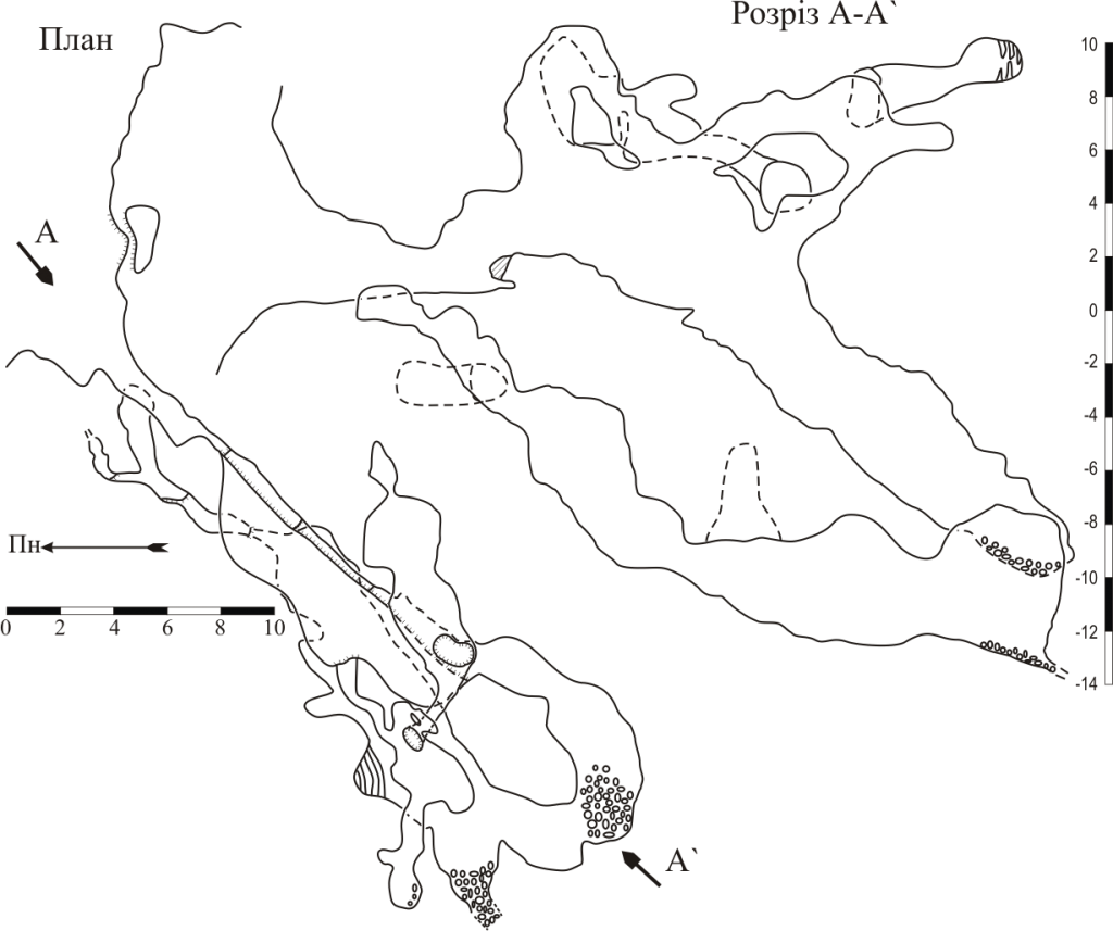 Печера має два поверха. Вхід в печеру починається невеликою галереєю в формі замкової щілини. Через три метри стеля різко піднімається вверх на висоту до 10 м. В залі є злегка похилений колодязь, глибиною 13 м.