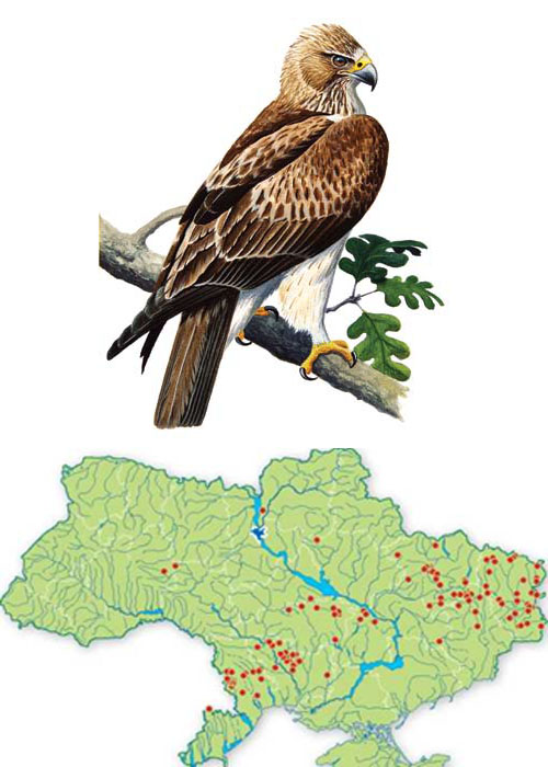 Гніздовий перелітний птах майже усієї території України (крім більшої частини Карпат і Криму). Весняний проліт починається у квітні. Летить поодинці або парами. Трапляється на ділянках старих широколистяних та мішаних лісів, що межують з відкритими просторами; рідше у байрачних і заплавних лісах степової смуги. З другої половини квітня займає гніздові ділянки і приступає до шлюбних ігор. Гнізда будує у верхній частині старих дерев (найчастіше на дубах), на висоті 10-27 м, в штучних лісах на пд. гніздиться на висоті до 4 м від землі. У кладці (кінець квітня — початок травня) 1-2 (рідше 3) яйця. Насиджує переважно самка, біля 30 діб. Пташенята залишають гніздо у липні — на початку серпня. Живиться переважно гризунами і птахами дрібних та середніх розмірів.