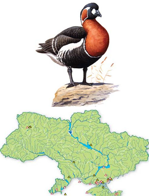 В Україні з'являється у жовтні-листопаді. Перельоти у зграях по 10-50 (іноді більше) ос., часто з іншими видами гусей. На лиманах Пн. Приазов'я затримується на 4-8 тижнів. На зи-мівлі утворює скупчення на озерах, ріках, найбільші — на мілинах лиманів Пн.-зх. Приазов'я, Сиваші, у дельті Дунаю. Кормові міграції на поля вранці та ввечері. Відлітає на початку березня. Живиться озиминою, зерном пшениці, рису, навесні також пагонами, листям та цибулинами трав'яних рослин. Гніздові біотопи — сухі ділянки тундри та лісотундри поблизу водойм з крутими берегами, острови.