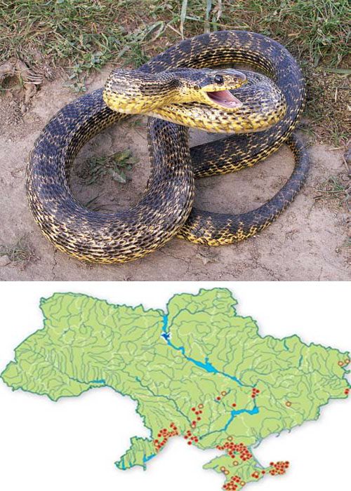 Змія значних розмірів: у особин з України довжина тулуба може досягати 132 см, довжина хвоста — 30 см. Луска з реберцем, навколо середини тулуба 25, рідше 23 рядів лусок. У дорослих верх тіла бурувато-жовтий, вздовж спини проходить ряд витягнутих упоперек тіла великих буро-коричневих або чорних плям. Черево солом'яно-жовте з мармуровим буруватим візерунком.