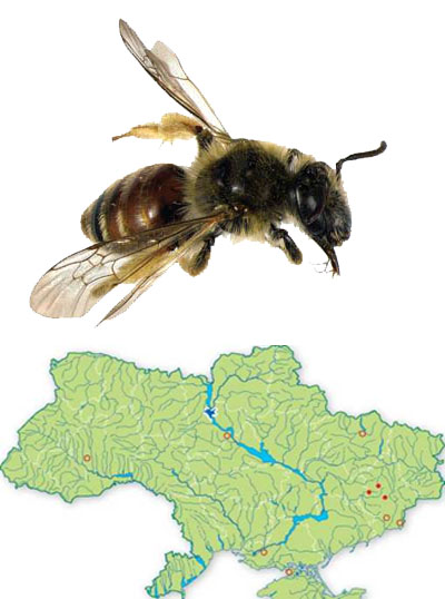 (За Осичнюк, 1977). Самка: довжина тіла 8-9 мм. Голова та груди чорні, крила жовтуваті. Джгутики вусиків знизу червонуваті або коричнюваті. В забарвленні черевця часто переважає червоний колір. Звичайно 1-3 тергуми червоні з жовтими вузькими вершинними краями, 4-5 тергуми завжди чорні. Лапки всіх ніг та гомілки задніх, іноді й середніх, червоно-жовті. Тім'я та груди зверху в досить довгих іржавочи коричнювато-жовтих або жовтих волосках, на боках і знизу голова та груди в білуватих або жовтувато-білих волосках. Проподеальний кошик та вертлюжний пучок рідкі та довгі, з білуватих волосків; гомілкова сумка густа, довга, золотисто-жовта. 1 тергум у досить довгих жовтуватих або білуватих волосках. 2-4 тергуми з широкими густими суцільними білуватими вершинними перев'язками. Анальна торочка коричнева або жовтувато-коричнева. Самець за скульптурою, кольором тіла та опушенням дуже подібний до самки. Наличник більш опуклий, з такою ж скульптурою, як у самки. Вусики короткі, ледве досягають вершини щитка середньоспинки. Опушення тіла, особливо голови та грудей, дещо довше, кудлатіше, ніж у самки. Довжина тіла 7-8 мм.