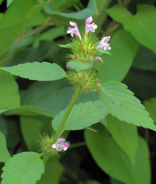 Однорічна трав'яниста щетинисто-залозиста рослина родини губоцвітих. Стебло чотиригранне, прямостояче, розгалужене, під вузлами потовщене, 10— 60 см заввишки. Листки супротивні, прості, черешкові, яйцевидно-ланцетні, з округлою основою й загостреною верхівкою, по краю великозубчасті, з 4—12 зубцями на кожному боці. Квітки двостатеві, з двогубим пурпуровим віночком, зібрані в несправжні кільця, які утворюють головчасті суцвіття. Плід — з 4 горішків. Цвіте у червні — вересні.