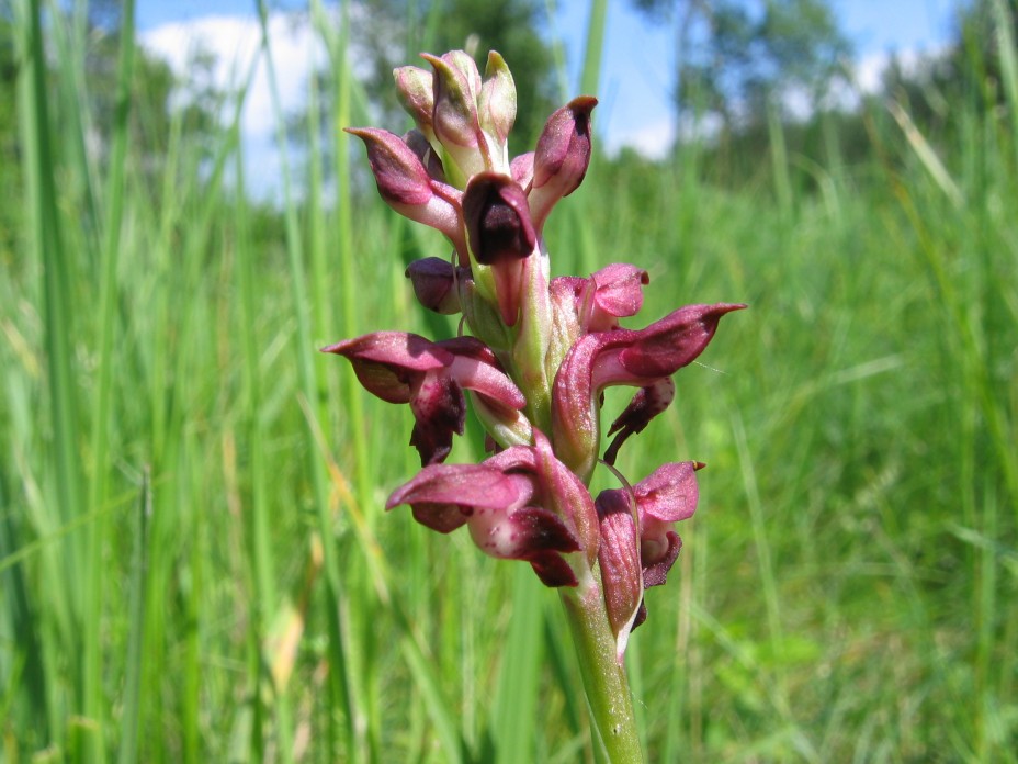 Orchis coriophora — багаторічна трав'яниста рослина родини зозулинцевих (орхідних). Бульби кулясті або яйцевидні, іноді (дуже рідко) довгасті. Стебло циліндричне або злегка гранчасте, 15—30(45) см заввишки, вкрите листками майже до суцвіття. Листки сизувато-зелені, досить численні (до 8 — 10), лінійні або лінійно-ланцетні, гострі, спрямовані вгору; нижні — до 8—9 мм завширшки; верхні — згорнуті навколо стебла. Квітки неправильні, бурувато-пурпурові, з запахом клопів, зібрані в багатоквітковий, густий, довгастий колос; шолом дзьобовидно-загострений; губа трилопатева, повисла; шпорка зігнута, конічна, повисла, вдвоє коротша за зав'язь. Плід — коробочка. Цвіте у червні—липні.