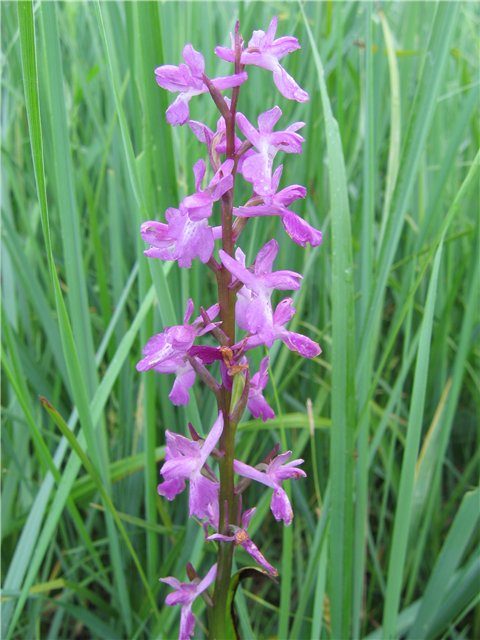 Orchis palustris — багаторічна трав'яниста рослина родини зозулинцевих (орхідних). Бульби овальні. Стебло порожнисте, 18—30 см заввишки. Листків 3—6, вони лінійно-ланцетні, жолобчасті, від основи до верхівки поступово звужені, гострі, спрямовані вгору. Квітки неправильні, бузково-пурпурові, зібрані в рідкий колос; листочки оцвітини довгасті, тупі, з трьома жилками, а бокові відхилені назад; губа трилопатева, бокові лопаті значно більші за середню (іноді губа дволопатева); шпорка пряма, циліндрична, коротша за зав'язь, горизонтальна або іноді косо спрямована вгору. Плід — коробочка. Цвіте у травні — червні.