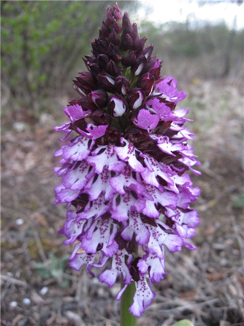 Багаторічна трав'яниста рослина родини зозулинцевих (орхідних). Бульби видовжено-яйцевидні. Стебло пряме, 30—75см заввишки, товсте, вгорі пурпурово-забарвлене. Листки здебільшого зближені в нижній частині стебла, еліптично-ланцетні або довгасті, гострі, зверху блискучі, зісподу — блідіші й сизуваті; верхній листок — у вигляді довгої піхви, згорнутий навкруги стебла. Квітки двостатеві, неправильні, запашні, в густому циліндричному колосі; шолом яйцевидний, гострий, коричнювато-пурпуровий; губа ясно-рожева з темно-пурпуровими крапками, обернено-яйцевидна, трироздільна; шпорка циліндрична, на кінці часто розширена і виїмчаста, в 2,5—3 рази коротша за зав'язь. Плід — коробочка. Цвіте у травні—червні.