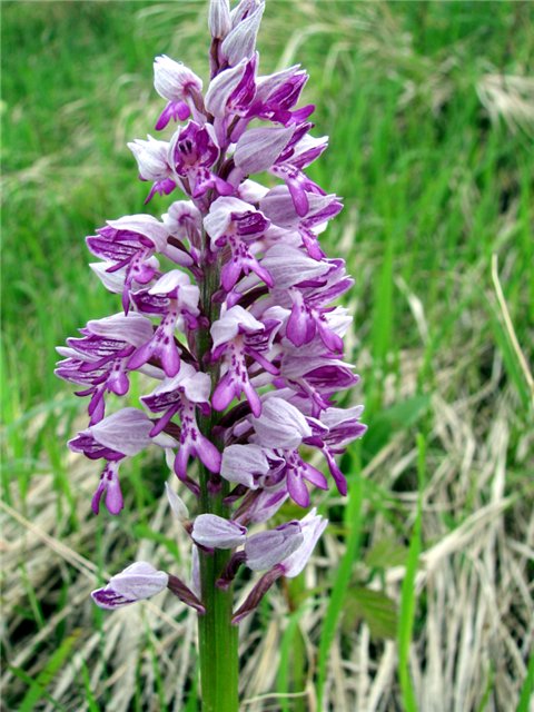 Orchis militaris — багаторічна трав'яниста рослина родини зозулинцевих (орхідних). Бульби яйцевидні. Стебло 15— 40 см заввишки, злегка гранчасте, вгорі — фіолетове. Листки видовжено-еліптичні: нижніх — 2-4, вони великі, зближені, жолобчасті, гострі; верхніх — 1-2, вони згорнуті навколо стебла. Квітки двостатеві, неправильні, зібрані в густе колосовидне суцвіття. Шолом блідо-рожевий, гострий; губа трилопатева, пурпурова, середня її частка — з рожевими ворсинками і на верхівці вона розділена на дві овальні або довгасті лопаті (до 4 мм завдовжки), з зубцем між ними; шпорка тупа, вдвоє коротша за зав'язь. Плід — коробочка. Цвіте у червні.