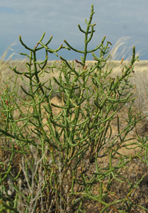 Anabasis aphylla — сукулентний напівкущ родини лободових, 20—70 см заввишки. Пагони голі, соковиті, ламкі, в нижній частині дерев'яніючі. Листки супротивні, недорозвинені, утворені двома зрослими лусками. Квітки двостатеві, маленькі, зібрані у волотевидні суцвіття. Плід соковитий, ягодоподібний. Цвіте у червні —липні.